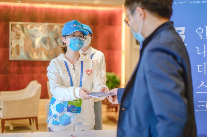 活动当天,志愿者们引导嘉宾入场、采访、就餐,陪同嘉宾参与会议,筹办音乐冷餐会的文艺演出,时刻提供必要的帮助。连续几天高强度的工作使志愿者不由感到疲惫,但是他们始终热情洋溢地面对每一位嘉宾,一丝不苟地做好每一项工作。“此次中韩投资贸易博览会是盐城的一大盛会,作为地处盐城的高校,能为大会出一份力,是我们义不容辞的责任。同时,这也是一个很好的平台,师生们在参与志愿服务的过程中,开阔视野,精进专业,提升能力。”朝鲜语专业教师梁海胜表示。